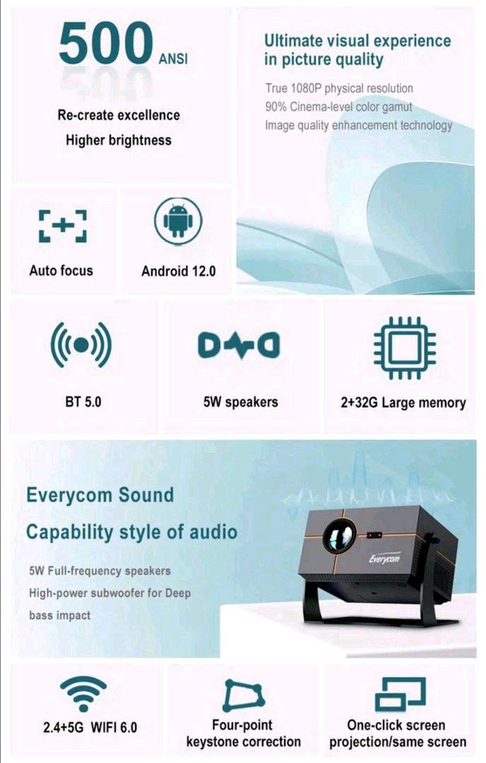 Совершенно новый модель проектора от бренда Everycom. Настоящий кинотеатр у вас дома на огромном экране теперь не надо беспокоиться от раздражение глаз просмотра передач как например в телевизоре от него всегда болят и устают глаза. Эти проекторы совершенно безвредны для глаз человека можете вечерком смотреть любимые фильмы и сериалы на этом проекторе в огромном экране. Уже в продаже!! Яркость: 12.000 люмен Разрешение: 1920х1080 Лампа: Светодиод с ресурсом 50.000 часов Система: Андроид 12.0 Фокус: Автоматически по всем параметрам Аудио: 2х5 ватт Мощность: 150 w Контрастность: 10.000.1 Память: 2гб 32 гб Производитель: Everycom Китай