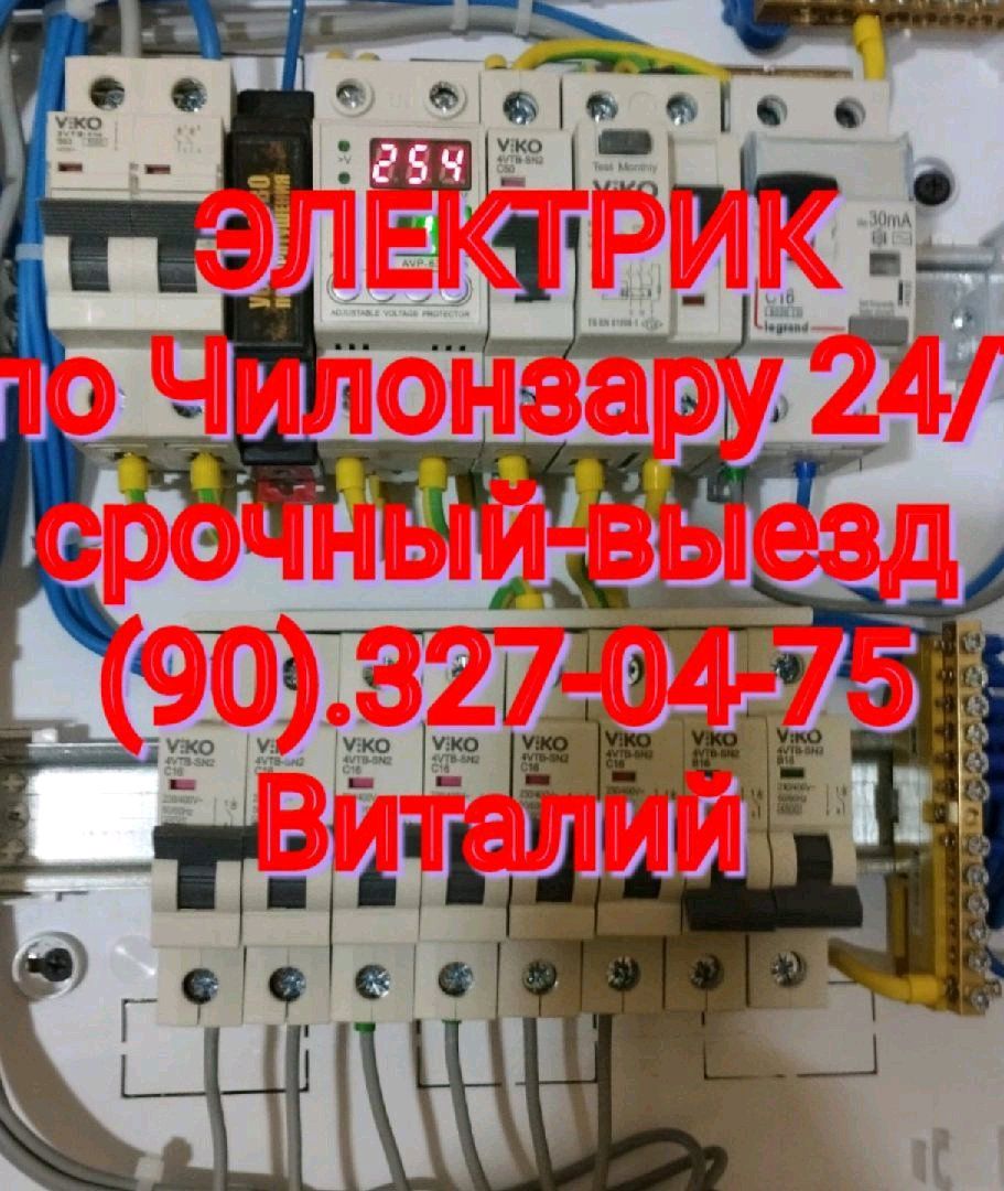 Электрик по Чилонзару24/7 Срочный-выезд Установка зарядок.электрмашинэлектромонтаж,установка электро приборов, исправим все ваши неполадки.капремонт щита, оформления пломбы в энергезбыте,(при необходимости) Установка стабилизаторов+генераторов. 220/380в. Виталий.ф/о.уз.карт.нал.